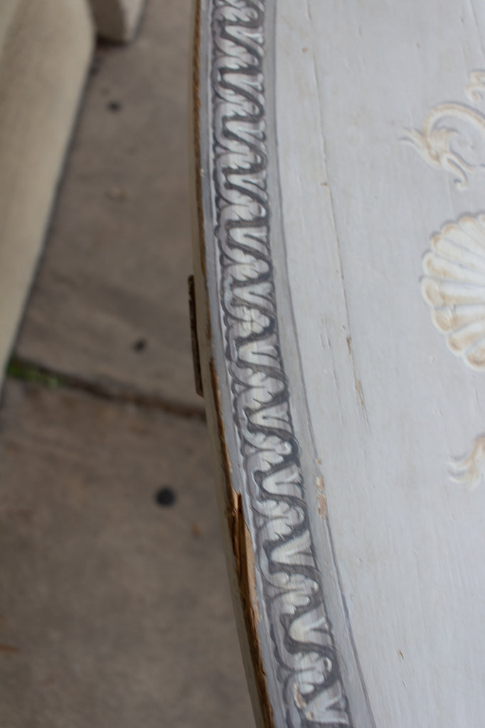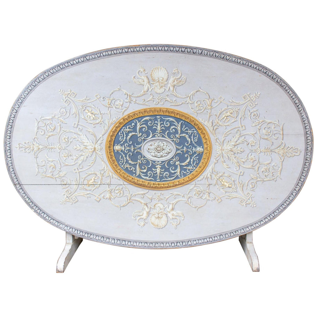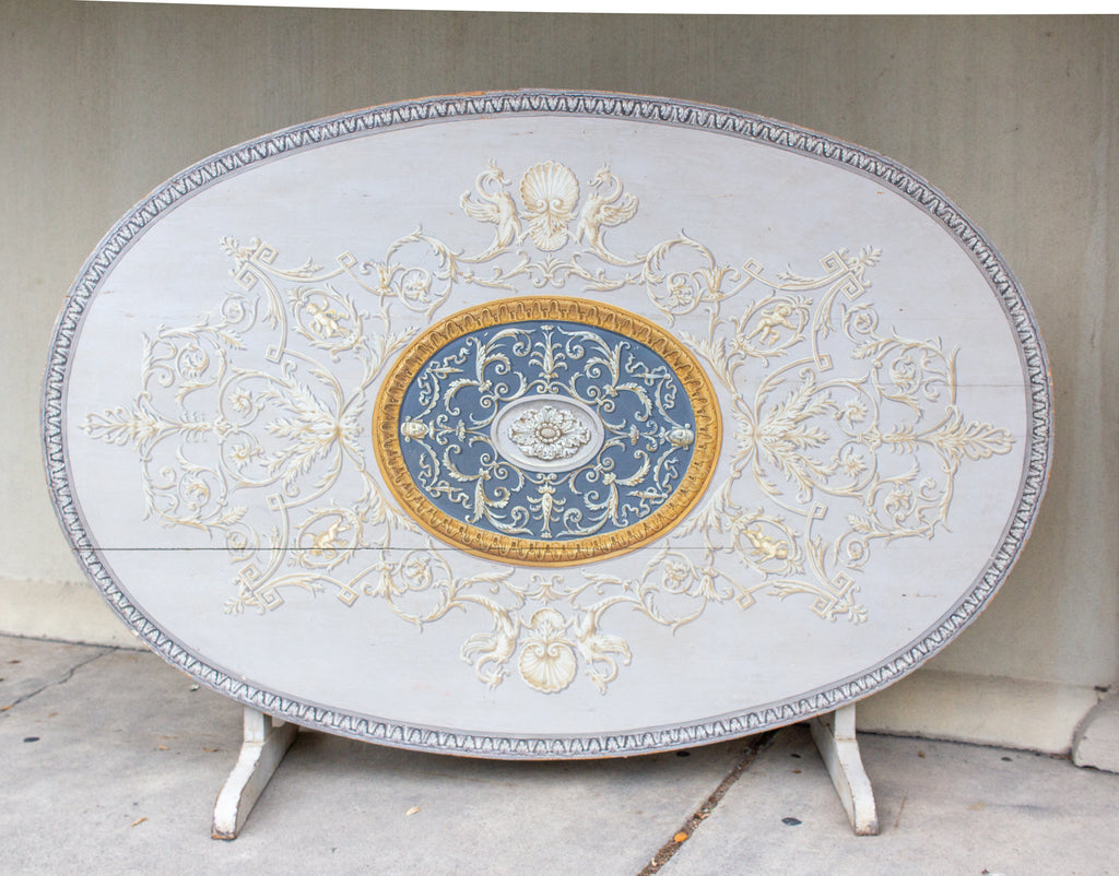Exquisitely painted, this large scale French wine table was recently discovered in Europe and makes for an exceptionally beautiful dining table or entry table for the foyer. Wine tables are traditionally used during the vendange fall harvest for wine tastings but a table with this level of detail likely originated from a French chateau. Highly detailed trompe l'oeil painted detail with grey and cream tones accented by gold and charcoal grey, giving the illusion of a three dimensional architecturally detailed effect.