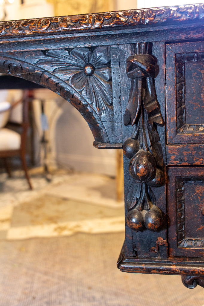 • This is an antique Jacobean revival styled desk with four drawers and beautifully carved details. The edge of the top of the desk is hand carved along with the front and sides, with palmettes and floral carvings. The legs are beautifully turned in gadroon shape with additional carved details and there is a turned center support at the bottom. Carved pendants and scrollwork also appear on the front of this desk which has an arched opening at center to accommodate seating.
