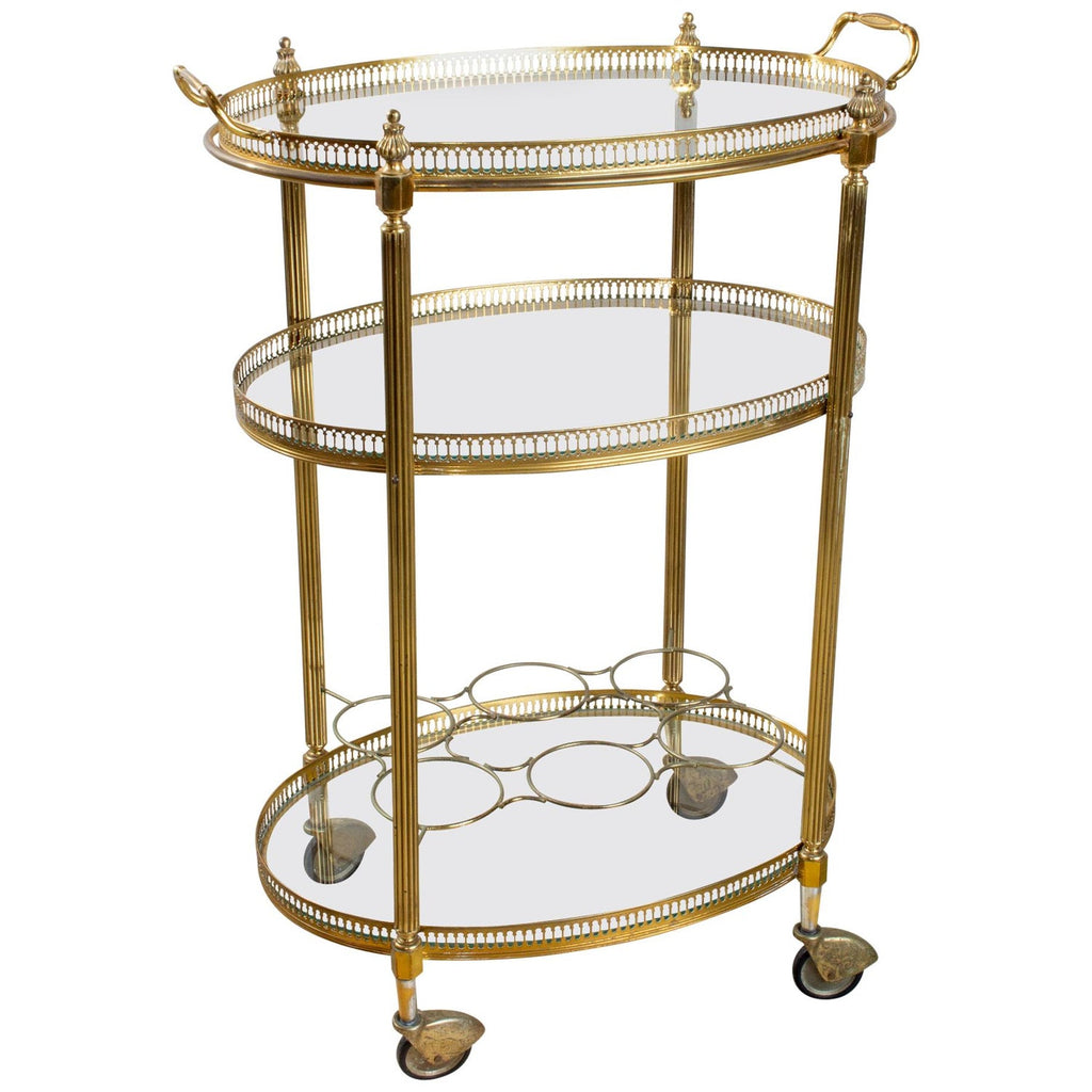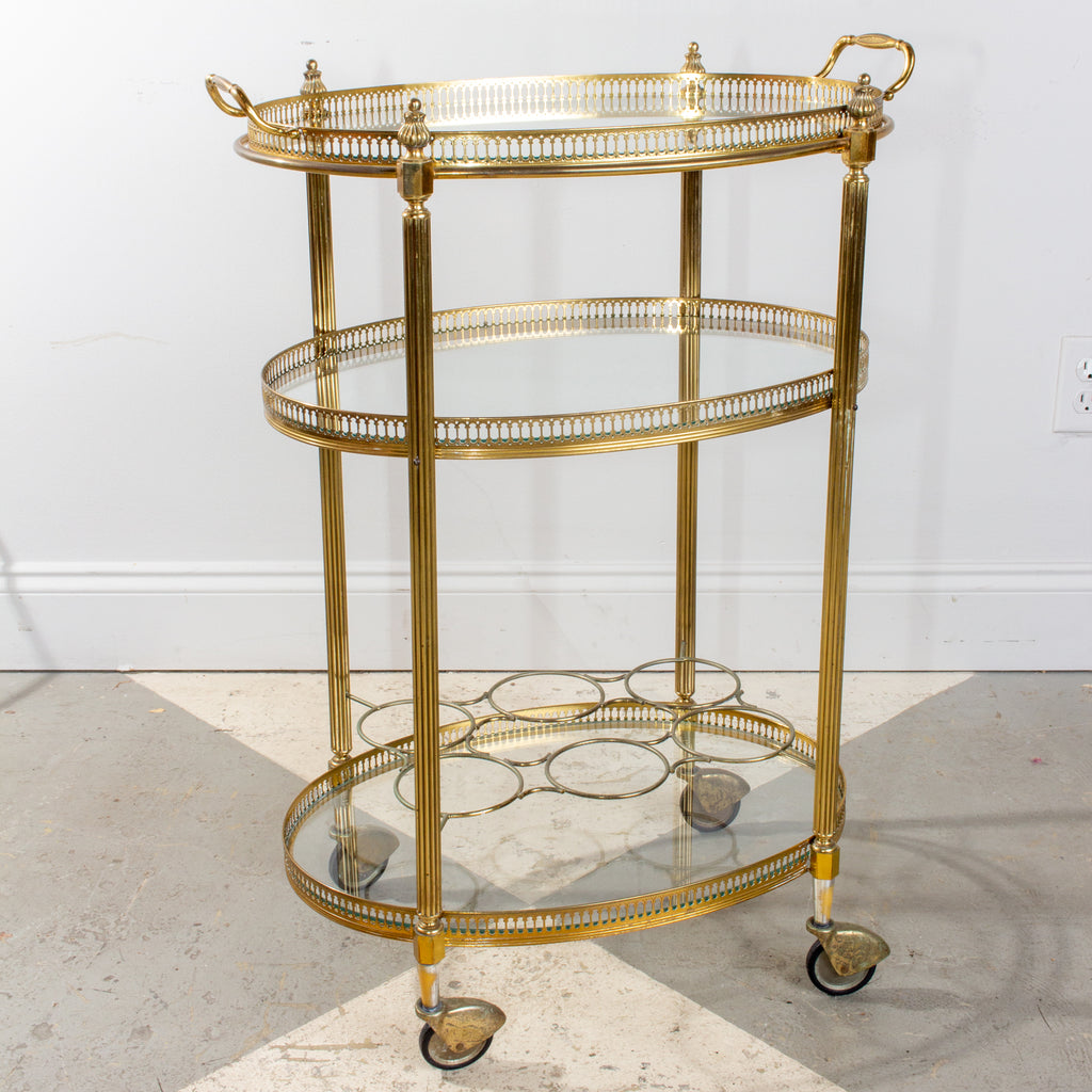 Mid-Century French Brass & Glass Oval Bar Cart with Removable Top Tray