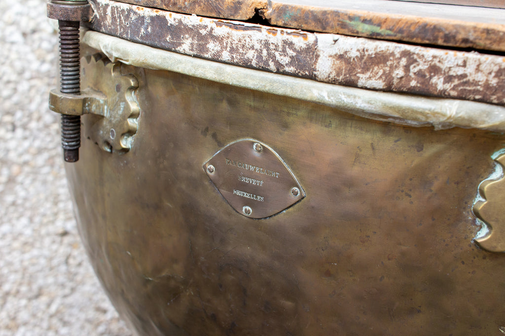 Lovely patina on each brass plate feature the wording of the maker "VAN CAUWELAERT BREVETÉ BRUXELLES" on each drum. Period wooden tops to protect the skin offers the optionality of using within the home as spectacularly interesting end tables flanking a large scale sofa or as an interesting and unique tables on their own.