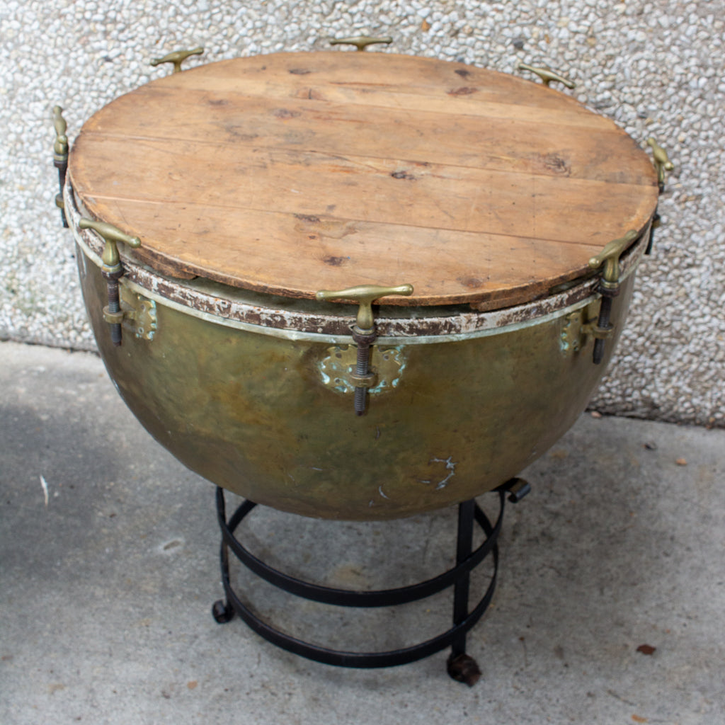 Discovered during our recent European travels, we instantly fell in love with this pairing of antique kettledrums on iron stands crafted by noted musical instrument maker F. Van Cauwelaert from Belgium during the 19th century. Many of Van Cauwelart's pieces are included in Museum collections around the world including The Met in New York. Crafted from hammered copper with brass details and traditionally had stretched goatskin on the top creating the well known sound employed by percussion musicians for centuries. The ancestor of the modern timpani were drums used by Ottoman Empire military bands brought to Europe in the 15th century. Today’s timpani have come a long way achieving precision pitch and intonation. Companies such as Adams, Clevelander, Dresdner Apparatebau, Goodman, Hardtke, Poschardt, Ringer and Walter Light make up the timpani heard on concert stages around the world today.