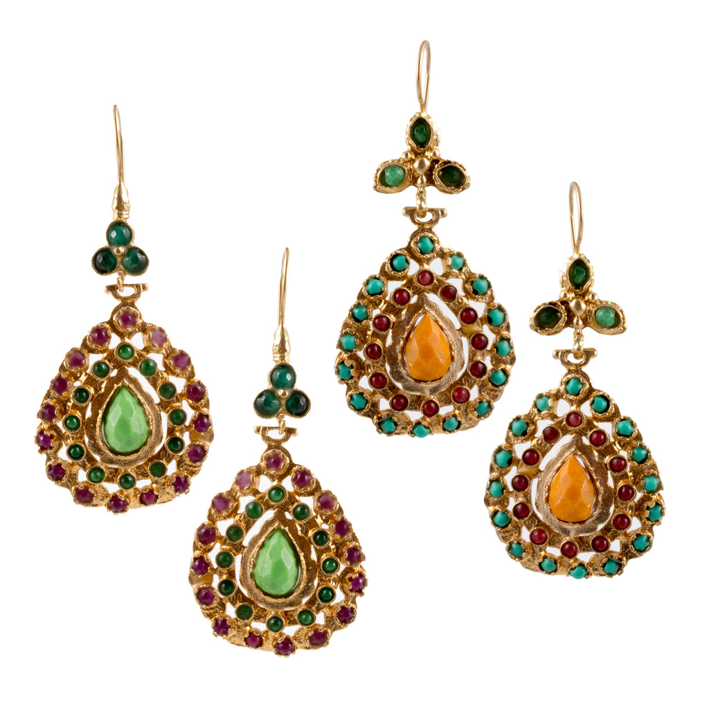 • A colorful pair of earrings, handmade by our artisan friends in Istanbul. These earrings feature a pear-shaped drop with a green or yellow stone, surrounded by colorful accents. Setting is hand-cast. Each pair will have a variance of tones in the natural stones. This is a stunning pair of earrings which could be dressed up or down. Choose from a bright green center with deeper green and red accents or a golden yellow center with red and turquoise accents.