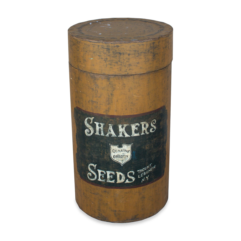 This vintage canister has a charming label that says "Shakers Seeds" on a deep green label and the body of the piece is an olive-toned tan color with distressed details. We love this as a decorative element or even as a small drinks table or side table that can also be used for storage.