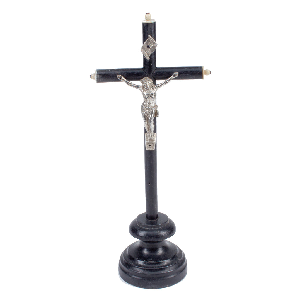 This is a vintage standing wood and metal crucifix sourced in Italy. The wood has a glossy black painted finish and the corpus and INRI banner are cast metal. The content is unknown, but it is a white metal that may be nickel plated. The base is round and the three exposed ends of the cross are finished with white caps and a bead.